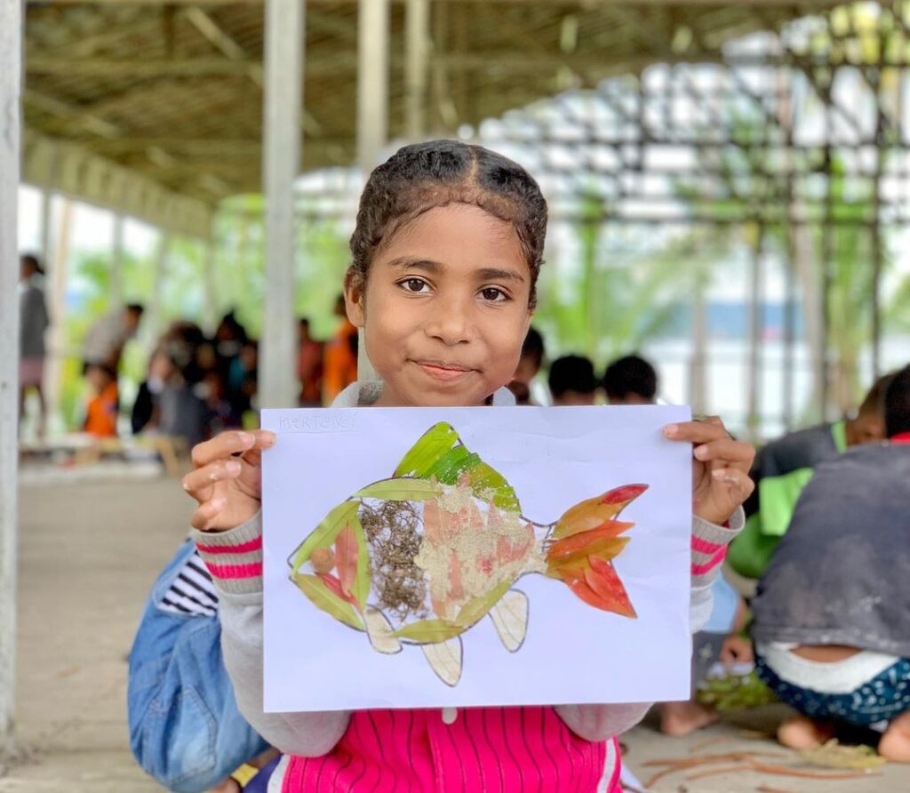 Sebagai contoh, anak-anak diajak melukis lalu mengeja nama-nama ikan yang sering mereka tangkap di laut, atau pepohonan yang mereka panjat saat bermain melepas penat.